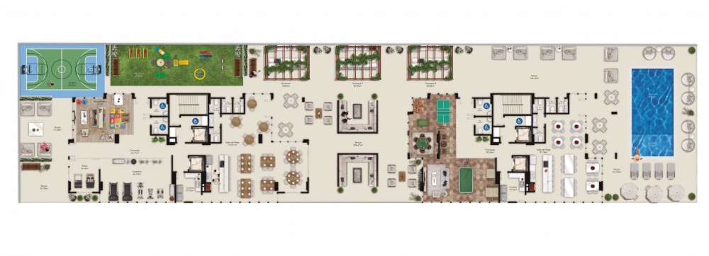 Quadra de Esportes, Lounge para descanso e lazer, Sala de jogos Adulto e Sala de jogos